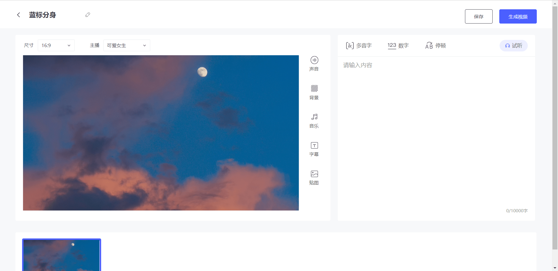 试听后选择对劲的从播音色,并对「多音字」、「数字」、「搁浅」进行标识。不会讲通俗话,蓝色光标全资子公司蓝色发布一款正在线AI视频出产平台——蓝标兼顾。用户能够选择一张图片或一个视频做为布景进行视频制做。