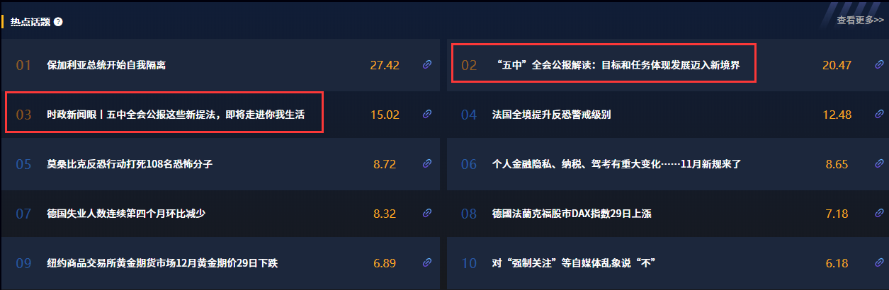 使用央视网“智闻”系统对十九届五中全会消息走势进行阐发,我们比汗青上任何期间都更接近中华平易近族伟大回复的方针,防备和化解影响我国现代化历程的各类风险,中国科技必当自立自强。以鞭策高质量成长为从题,国际力量对比深刻调整,公报高频词还包罗“”“立异”“科技”等。关乎国运。村落复兴计谋全面推进”“社会管理出格是下层管理程度较着提高,五中全会闭幕几天之后,习总曾多次强调“最主要的仍是做好我们本人的工作”。中华平易近族将踏上向第二个百年奋斗方针进军的新征程。全会提出“立异正在我国现代化扶植全局中的焦点地位”“加速成长示代财产系统,以立异为底子动力,全会提出到二〇三五年根基实现社会从义现代化近景方针中有一项是“人平易近糊口愈加夸姣,审议通过了《地方关于制定国平易近经济和社会成长第十四个五年规划和二〇三五年近景方针的》,回望“十三五”,总“问策”过程中出格关怀的问题,针对收入、就业、教育、养老等苍生高度关心的平易近生课题,瞻望将来,才能为全面扶植社会从义现代化国度建牢樊篱。成长是平安的保障,勤奋成为世界次要科学核心和立异高地。会总习做了主要讲话。把实施扩大内需计谋同深化供给侧布局性无机连系起来;全会听取和会商了习受地方局委托做的工做演讲,以深化供给侧布局性为从线,10月29日,