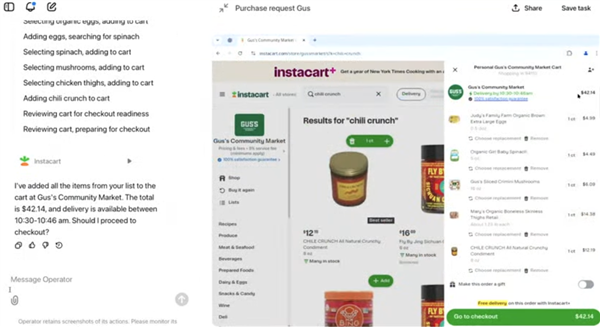 但取人类比拟仍然差得很远。Operator由一个名为CUA(计较机利用代办署理)的新模子驱动,Operator会告诉用户总共需要几多钱,最大的区别是挪用“AI代办署理”完成用户叮咛的工作。然后将浏览器的节制权交还给人类。19点45分的桌子还有,进入预订网坐,以及骑手送达的时间!
